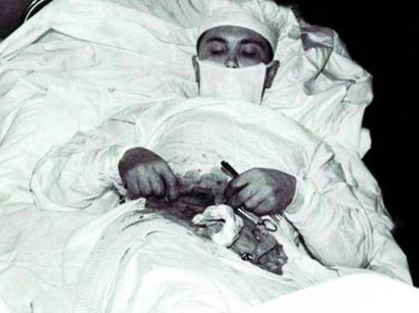 E’ un chirurgo: perfettamente in grado di riconoscere la sua malattia, e anche di rendersi conto dello stato di necessità. Si fa aiutare da 3 persone: un meccanico, un meteorologo e il Direttore della stazione. Gli avrebbero passato i ferri, sistemato la lampada e orientato uno specchio per consentirgli di vedere meglio il campo operatorio. Si fa sistemare in posizione semiseduta. Non indossa guanti, per affidarsi soprattutto al tatto. Si somministra l’anestesia locale e incide il suo addome. L’intervento dura un paio d’ore interminabili: ogni 5 minuti deve fermarsi, sopraffatto da stanchezza, nausea e sudorazione profusa. Nonostante le accortezze, non riesce a vedere bene, e si causa accidentalmente una lesione intestinale, che poi prontamente ripara.